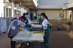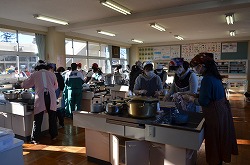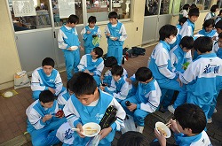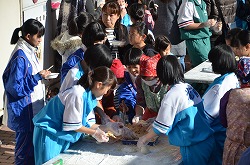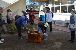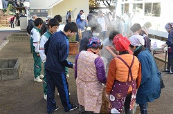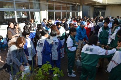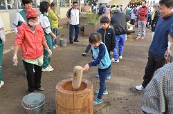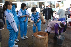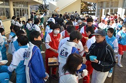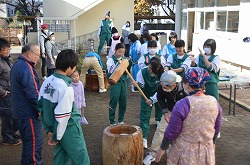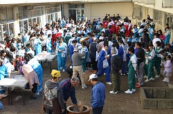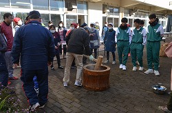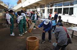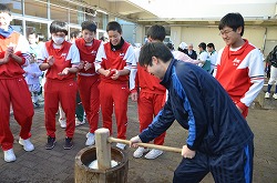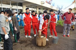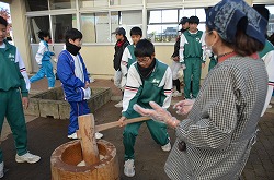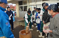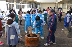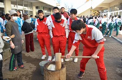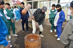 本日2日(土)、PTA、更生保護女性会、地域、学校応援団,親父の会の方々のご協力を得て、200名以上の生徒たちが参加して、総勢約300名で盛大にもちつき大会を実施しました。もち米60kgを4つの臼でつき、あべかわもち、からみもち、お汁粉、海苔もちを作りました。つきたてのもちはとても美味しく、思い出に残るもちつき大会になりました。みなさま、本日はありがとうございました。