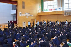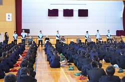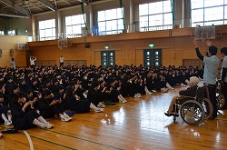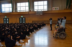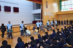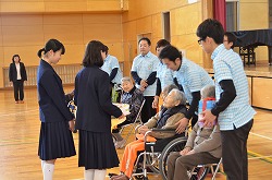 特別養護老人ホーム「フラワーヴィラ」さんより入所者7名(最高齢104歳)を本校体育館にお迎えし、福祉委員会による「福祉の心を育む懇話会」を行いました。最初に2年生のSさんより、フラワーヴィラさんでの社会体験チャレンジの体験談の発表後、入所者7名の方々よりお話をいただきました。次に、フラワーヴィラの入所者や職員の方々、生徒や本校職員、全員で「ふるさと」を手話を交えながら歌いました。最後に、本校より福祉委員会で集めた手ぬぐい・ティッシュ・歯ブラシを贈呈し、フラワーヴィラさんより図書を寄贈していただきました。朝の短時間でしたが、入所者の方々から「元気」をいただきました。いつまでもお元気でいてください。本日は、誠にありがとうございました。