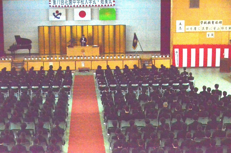 地元選出の5名の市議会議員様、花園総合支所長様、花園公民館長様を始め23名の御来賓の皆様方の御臨席を賜り、厳粛に第71回花園中学校入学式・始業式を挙行いたしました。110名の新入生が入学し、全校生徒331名となりました。新入生の落ち着いた態度と元気な返事がとても頼もしく感じられた入学式・始業式でした。