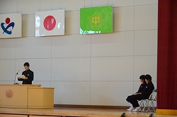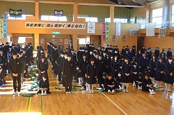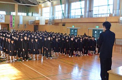 体育館で2学期終業式を行いました。終業式では、1年生はSさん、2年生はN君、3年生はK君が学年を代表して、「2学期を振り返って」を発表しました。とても堂々とした、素晴らしい発表でした。校長先生の講話では、ラグビー日本代表の五郎丸歩選手の五郎丸ポーズを例に挙げ、ルーティーン(習慣)の大切さを話されました。具体的には、①目標を具体的に立てる。②習慣は質より量が大切である。③よい習慣を身に付ける。さらに、運動、散歩、音楽鑑賞・・・・などにより、ストレスを発散することの大切さも話されました。終業式後には、2学期、清掃を特に頑張った生徒に贈る「清掃奨励賞」の授与者の発表と代表生徒への賞状伝達を行いました。今回は、146名に「清掃奨励賞」が渡されました。これは、学校全体の清掃への取組が、尚一層向上したことだと感じています。生徒のみなさんの活躍が多く見られた2学期でした。3学期も、期待しています。