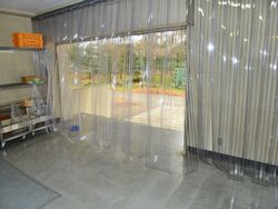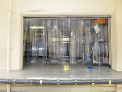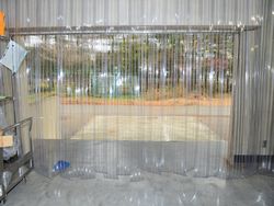 白鷺の糞や羽毛などが給食に混入しないように、給食の搬入口に厚手のビニールのカーテンを設置しました。北風にも効果があり、だいぶ改善されました。