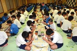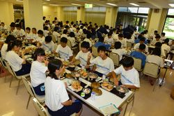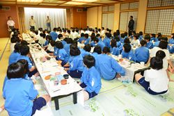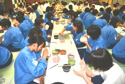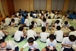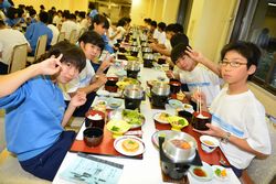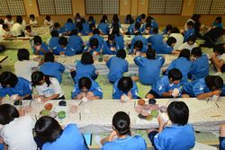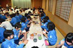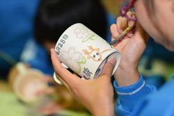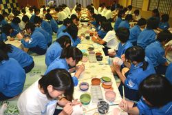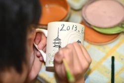 修学旅行2日目の夜は、おいしい夕食(すき焼き)をいただいた後、清水焼の体験をしました。準備してきた絵柄を素焼きしたマグカップに書き込みました。世界に一つのオリジナルマグカップです。