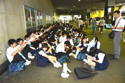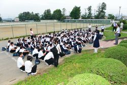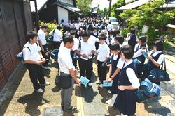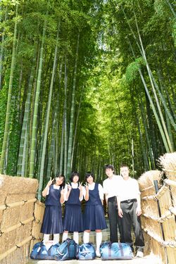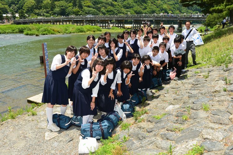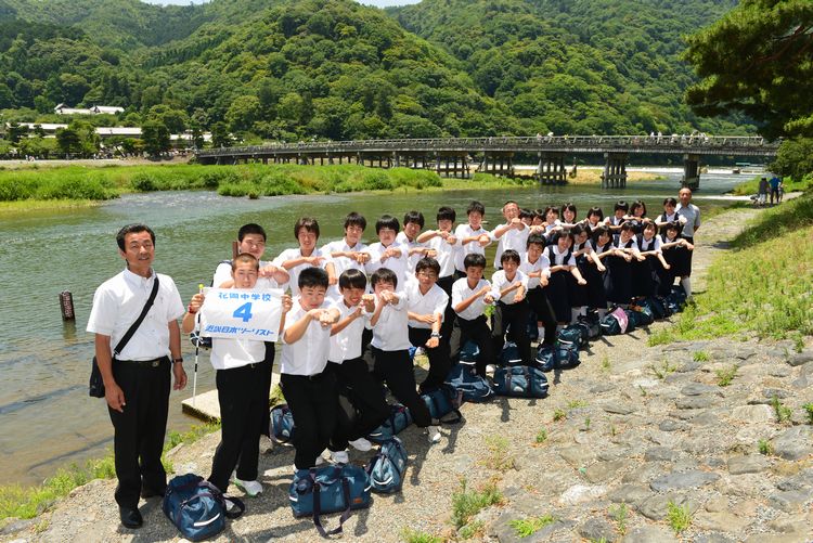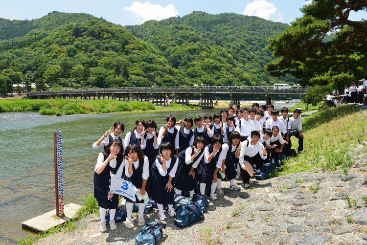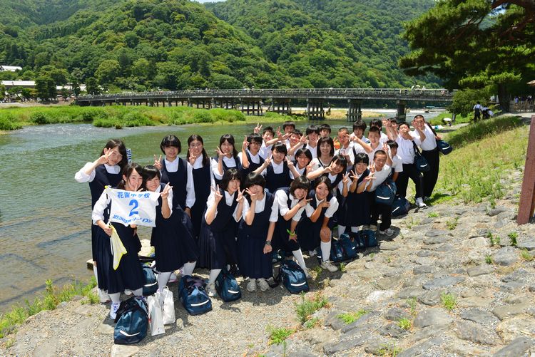 渡月橋に全員時間通りに集合し、クラスごとに記念撮影です。(4組、3組、2組、1組の順)
