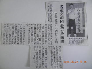 第31回成田山全国競書大会で上位入賞した14人が8月4~8日、日中友好少年少女書道交流団として中国・北京を訪問しました。本校から読売大賞を受賞した3年生男子O君が参加しました。書道交流会では、書道を通して交流し、理解がもっと広がっていくことを念じながら、中国側から参加した同年代の少年少女とその場で作品を書き上げました。