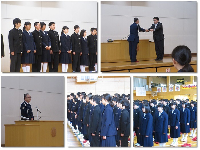 今朝の集会では、花園中学校が交通安全推進校として、寄居警察から委嘱状を授与していただきました。登下校等の際には交通安全に気をつけて、事故ゼロを目指しましょう。
