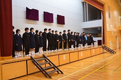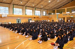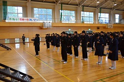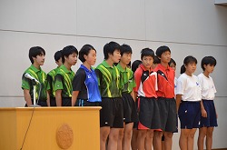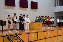 全校朝会で県大会壮行会を行いました。陸上部、剣道部、柔道部、男女卓球部、男女ソフトテニス部の代表者から、県大会に向けての力強い決意発表がありました。県大会では、地区の代表者として、全力で戦ってきてください。健闘を祈っています。