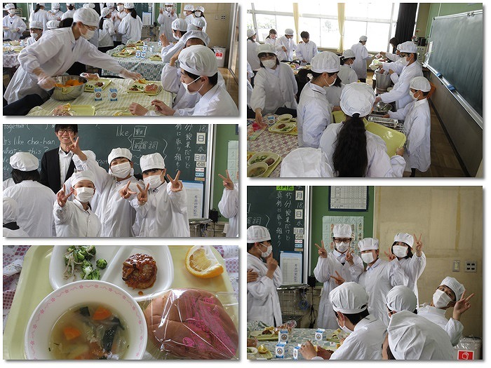 今日は先生方が出張のため、午前中授業でした。写真は給食の時の様子です。2年生がカメラを向けると元気にピースしてくれました。ありがとうございます!