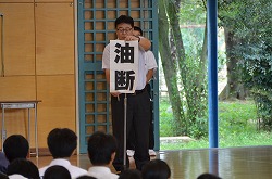 22日(金)、生徒集会で運動部の新人戦に向けての壮行会と文化部の活動発表を行いました。三年生を代表して前部長会長の小池峻也君より激励の話を行い、三年生からは体育祭の各団の応援を新人戦バージョンに変えて三年生の全学級よりエールを元気に行いました。最後に校長先生より、「油断」が大敵であるというお話をいただきました。運動部のみなさん、新人戦では今までの練習の成果を十分に発揮してください。文化部のみなさん、これからも作品制作など頑張ってください。