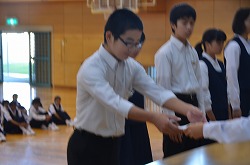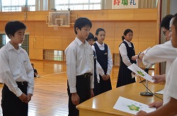 3日(火)、体育館で生徒会本部役員引継式を行いました。始めに、新生徒会副会長の1年 柴崎夢叶さんより退任する6名の旧本部役員に感謝状が渡され、旧本部役員より感謝の言葉が述べられました。次に、新生徒会本部役員9名に校長先生より任命書が渡されました。最後に校長先生より、退任した本部役員へ労いのことばと新本部役員へ激励のお話をいただきました。