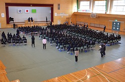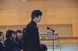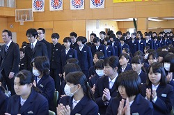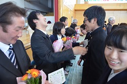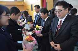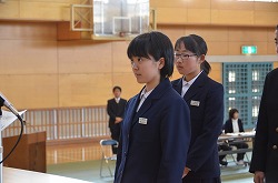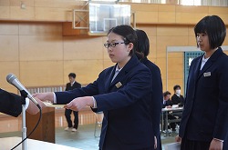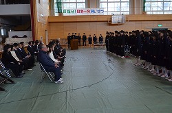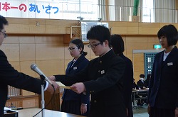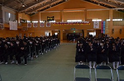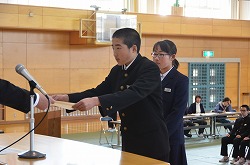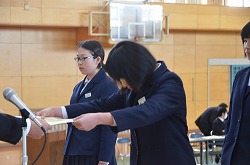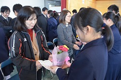 13日(火)の午後、卒業式予行、表彰、謝恩式を行いました。表彰では、「優秀生徒表彰」「体育優良生徒表彰」「産業教育優秀賞(2名)」「3箇年皆勤者表彰(36名)」「寄居警察署管内学校警察協議会善行賞(3部活)」の表彰がありました。次に、三年生が全教職員に向けて「謝恩式」を行ってくれました。謝恩式では、三年生より鉢花と心温まるメッセージを全教職員がいただきました。さらに、「あなたへ」を三年生全員が合唱してくれました。三年生からの感謝の気持ちが体育館中に満ちあふれた時間でした。卒業式まであと二日です。思い出をいっぱいつくって巣立ってください!
