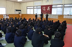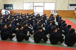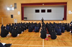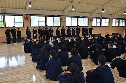 今年度最初の「学年朝会」を行いました。1年生は柔道場で①学年委員の紹介②あいさつの仕方③先生の話、2年生は剣道場で①学年委員の紹介②自然体験教室の組織・スローガン紹介③先生の話、3年生は体育館で①学年委員の紹介②学年委員長の話③チャイム着席について④先生の話、を行いました。遅刻する生徒もなく、落ち着いた雰囲気の中で行われました。