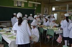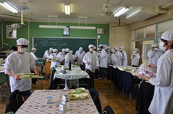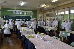 全ての学級で全員が給食着・帽子・マスク着用して、給食の準備を行っています。とても衛生的な準備です。