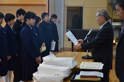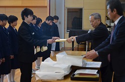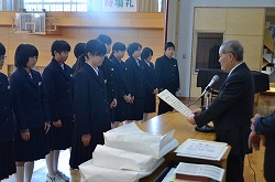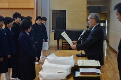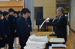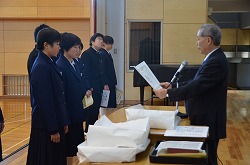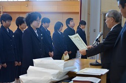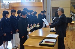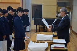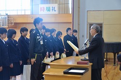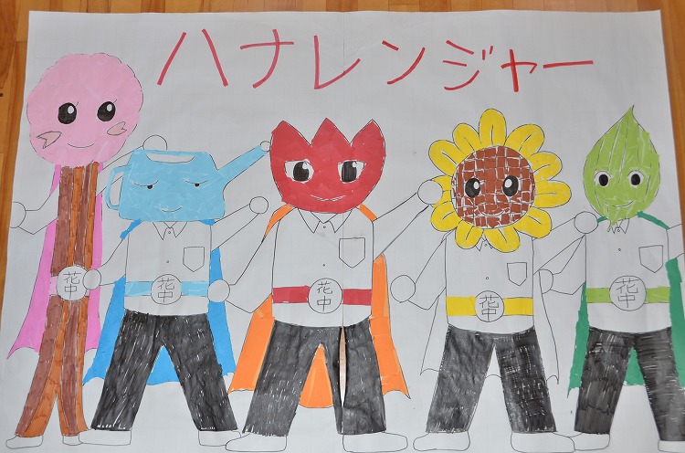 本日全校朝会で、全国中学校人権作文コンテスト、夢・きらきらアート展、児童生徒美術展(大里地区展)、寄居町バスケットボール大会、深谷市教育委員会体育賞(ソフトボール部・女子卓球部)、深谷市書き初め展、PTA広報誌コンクールの表彰を行いました。59名の生徒に賞状が伝達されました。PTA広報誌が県で「銅賞」となり、代表で清水教諭が賞状と盾を伝達されました。校長先生から、①自主的にゴミ収集所の整理を行ってくれました。交通指導員さんから素晴らしいあいさつをいつもありがとうございます。と、地域の方々からのお褒めのことばをいただきました。②自分自身をコントロールすることはとても大切です。とお話をいただきました。最後に、生徒会本部役員より花園中学校ユルキャラ:「ハナレンジャー」の発表がありました。花があふれる花園中学校にとてもあっている「ハナレンジャー」です。