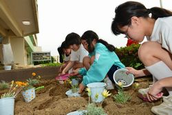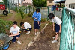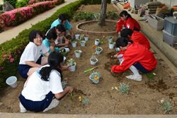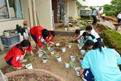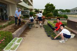 緑化委員会は、玄関前の花壇の植え付けとソフト部ネット裏の花壇の整備を行いました。