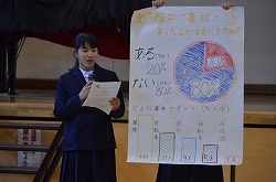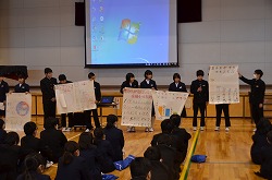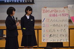 安全委員会による生徒集会を実施しました。はじめに、全校生徒で実施した「交通事故についてのアンケート」、「花中生が守れる交通ルール」、「花中生が守るべきことに」ついての集計結果の発表がありました。安全委員会より、①自動車に注意して自転車を運転しましょう。②自転車の1列運転、一旦停止を必ず行いましょう。③左右確認は必ず行いましょう。④安全運転を心がけ、自分の命は自分で守りましょう。と強調していました。次に、花園中学校区内の危険箇所3箇所の映像を映し、注意喚起を行いました。最後に、校長先生より指導講評をいただきました。交通事故に遭わないよう、十分に注意しましょう。