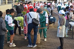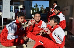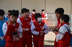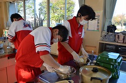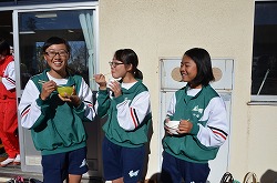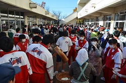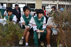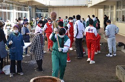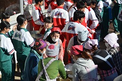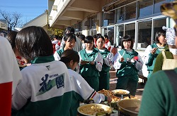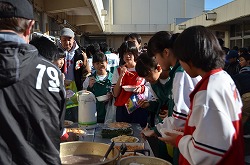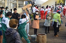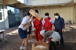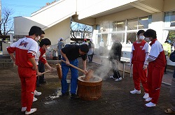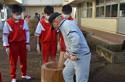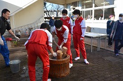 本日3日(土)、PTA、更生保護女性会、地域、学校応援団,親父の会の方々のご協力を得て、200名以上の生徒たちが参加して、総勢約270名で盛大にもちつき大会を実施しました。もち米80kgを4つの臼でつき、あべかわもち、からみもち、お汁粉、海苔もちを作りました。つきたてのもちはとても美味しく、思い出に残るもちつき大会になりました。みなさま、本日はありがとうございました。