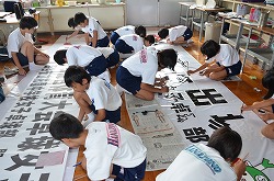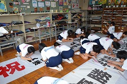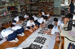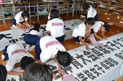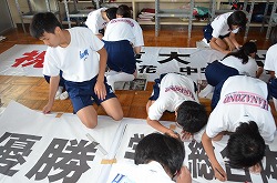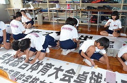 美術部のみなさんが、横断幕を制作してくれています。横断幕は、「ソフトボール部関東大会出場」「女子卓球部関東大会出場」「女子卓球部ダブルス県大会優勝」の3つです。心を込めて、真剣に取り組んでいました。横断幕の作成、いつもありがとうございます。
