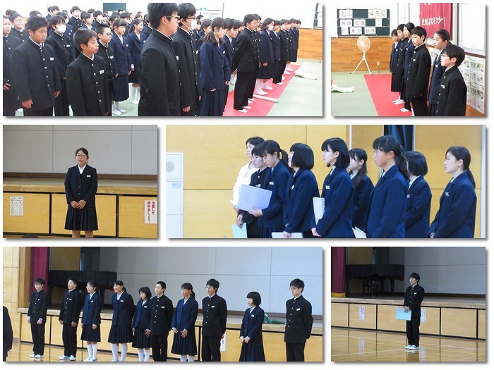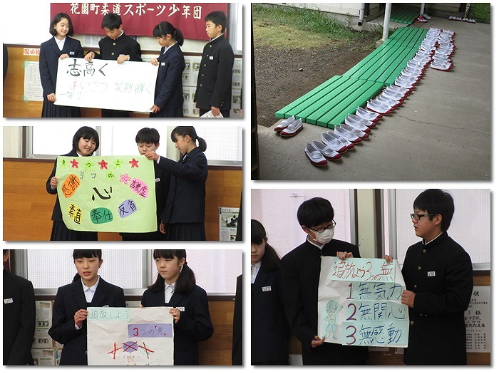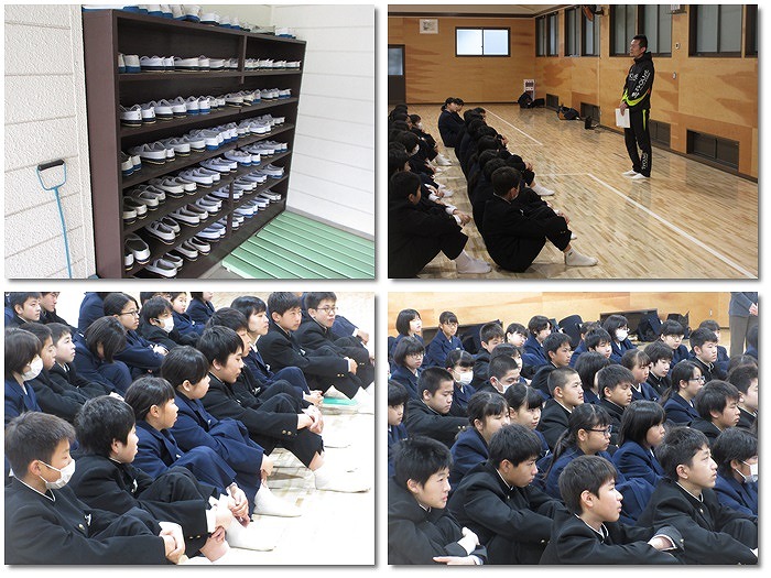 今朝は学年集会が行われ、2.3年生は宿泊行事に向けて、1年生は学年目標やクラス目標が発表されました。各会場に入る際、うわばきがきちんと並べられていました。