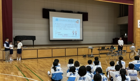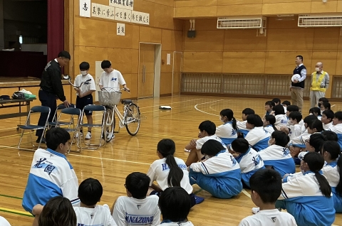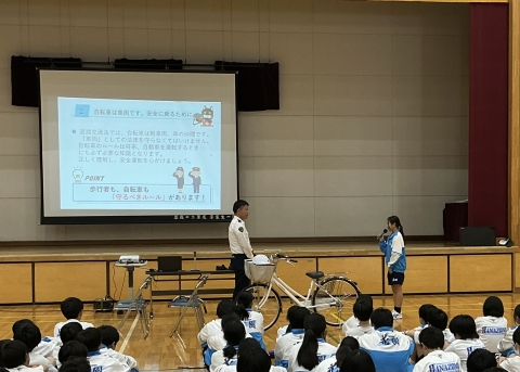 自転車の安全な走行について、寄居警察署、深谷市役所、交通協会の方々から、指導していただきました。登下校等で自転車を乗る際は、自分や自分の周りにいる人の命を守れるよう、危険を予測しながら、気をつけて走行しましょう。