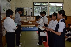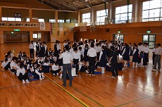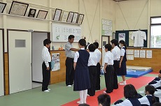 本日1年生が柔道場、3年生が体育館で学年集会を行いました。1年生は忘れ物に対する意識づけ・定期試験の取組・自学ノートの表彰、3年生は、修学旅行での整列隊形の練習を行いました。