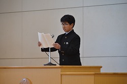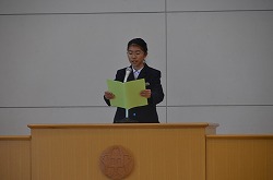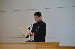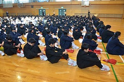 三学期始業式を行いました。1年生代表「田沼步莉さん」、2年生代表「新井唯人君」、3年生代表「稲原良君」が、新年の抱負を堂々とした態度で発表しました。とても立派でした。次に、向井校長先生より講話をいただきました。寒い日が続きますが、風邪等に気をつけ、有意義な三学期を過ごしてください。