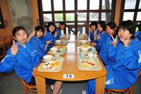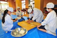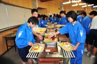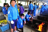 5月31日(木)の自然体験学習2日目もまずまずの天気に恵まれ、朝もやの中の朝礼、バイキングの朝食後、体験学習として、①まんじゅう作り、②うどん作り、③そば作り、④ペンダント作りに挑戦しました。講師の先生方は、「礼儀正しく、とても素直で一生懸命取り組む生徒ですね」とほめてくださいました。その後、お昼のカレーライス作りを班ごとに行いました。そして最後の閉校式です。