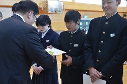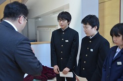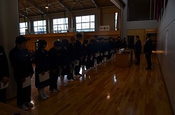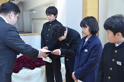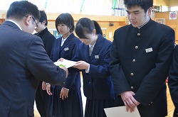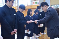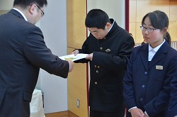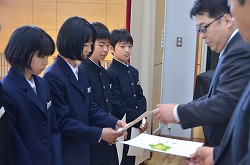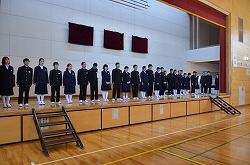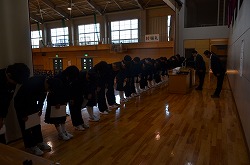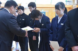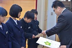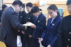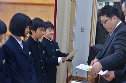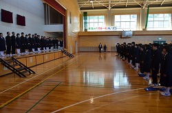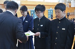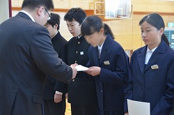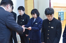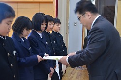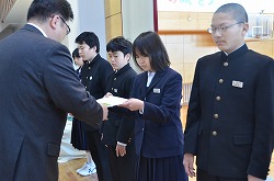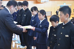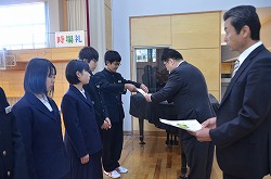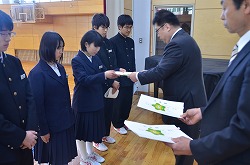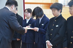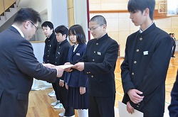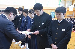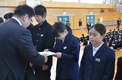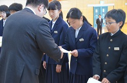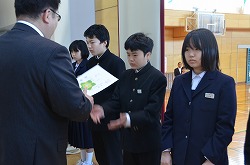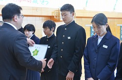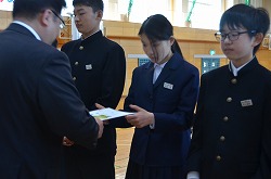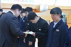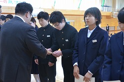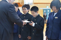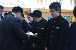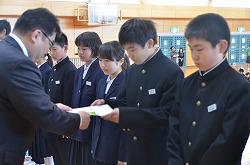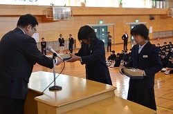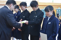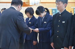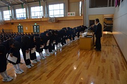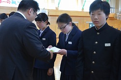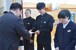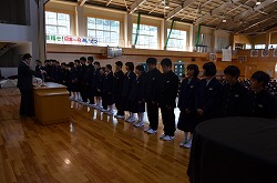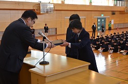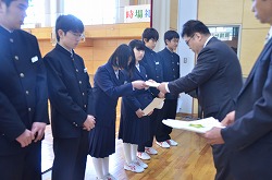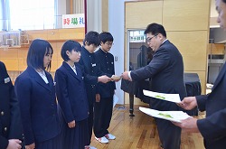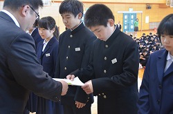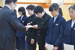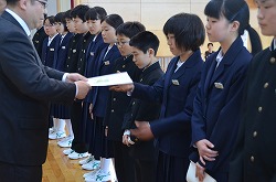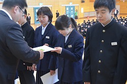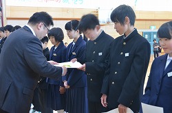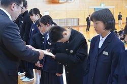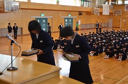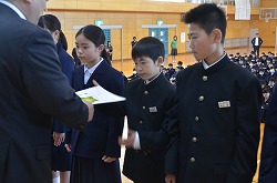 体育館での全校生徒の整列後、生活向上委員会と生徒会本部役員による「あいさつ運動」を行いました。本日の青空のように、さわやかで大きなあいさつが体育館に響き渡りました。任命式では、各クラスの学級委員・生徒会専門委員長・学年委員長に校長先生より任命書が渡されました。最後に、女子ソフトテニス部に賞状が渡されました。全校生徒が、真剣な態度でした。