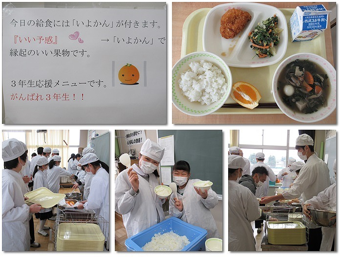 カツ丼「試験に勝つ」、いよかん「いい予感」、給食室から美味しいメッセージが届きました!いつも美味しい給食をありがとうございます。3年生、明日から頑張ってください!