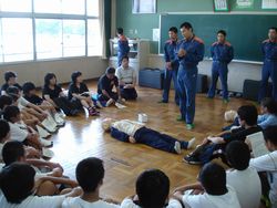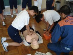 消防署の方々の指導のもと、心肺蘇生法の講習が教員や、部活動の部長を対象に行われました。