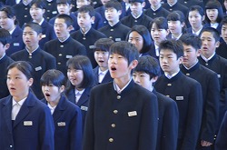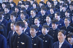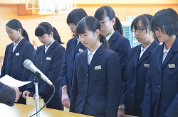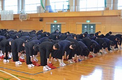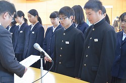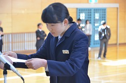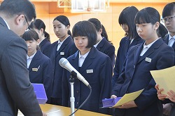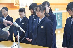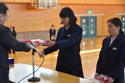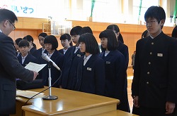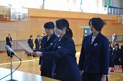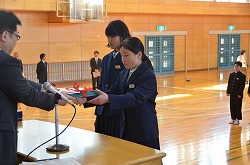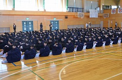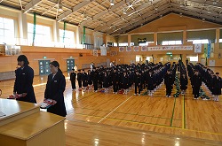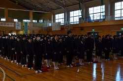 1・2学年修了式を行いました。式の前に、生活向上委員会と生徒会本部役員による「全校あいさつ運動」を行いました。次に校歌の指揮者「須藤智樹君」、伴奏者「松本詞梨さん」がステージに上がり、校歌の練習をしました。二つの学年でしたが、とても大きな歌声でした。修了式では、1年生代表「相澤奈央さん」、2年生代表「新井花奈さん」が校長先生より、修了証が渡されました。次に校長先生より①行事を通して、素晴らしく成長しました②夢や希望を持って、その実現に向けて努力してください③そのための準備をしっかり行ってください。と、「修了式のことば」をいただきました。修了式終了後、今年度最後の表彰を行いました。今回は、男子ソフトテニス部、吹奏楽部、清掃奨励賞(特に清掃を熱心に取り組んだ生徒)の表彰を行いました。最後に担当より、「春休みの生活」と「安全な自転車の運転」についての話を行いました。有意義な春休みを過ごしてください。