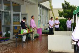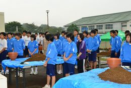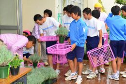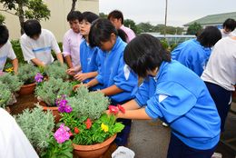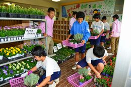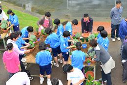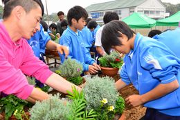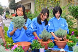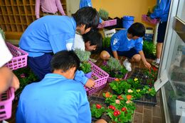 10月18日に、JAふかや鉢物研究会青年部のみなさんに御協力いただき、キッズガーデニング教室を本校で行いました。18種類の花や観葉植物等(ウィンターコスモス、ユリ、サントリーナ、パンジー、キンギョソウ、オステオスペルマムノースポール、ガーベラ、キャットテール、コバノランタナ、ストック、ネメシア、ドラセナ・サンデリアナ、ドラセナ・フロリダビューティー、ドラセナ・トリカラー、テーブルヤシ、ダイギンリュウ)から、5種類を選び、それらを大きな鉢に植える寄せ植えを学びました。どの生徒も一生懸命に花の植え方を学んでいました。