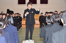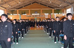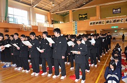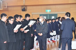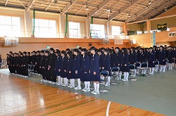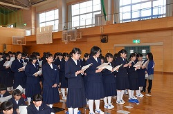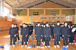 本日の2校時、体育館で卒業式に向けて「全校歌練習」を行いました。「校歌」、「深谷市歌」、「旅立ちの日に」の三曲を全校生徒、職員で練習しました。今日は、三年生の男子の男らしい歌声にとても心を打たれました。素晴らしい卒業式にしましょう。
