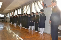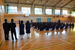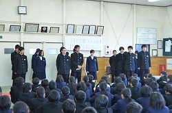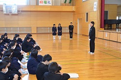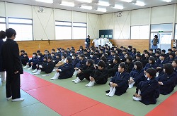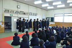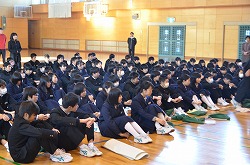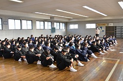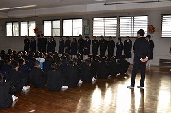 本日、1学年は柔道場、2学年は剣道場、3学年は体育館で学年集会を実施しました。1学年は「スキー教室に向けて」、2学年は「期末テストを振り返って・清掃の取組について」、3年生は「2学期を振り返って」でした。残り少ない2学期、充実した生活を送ってください。