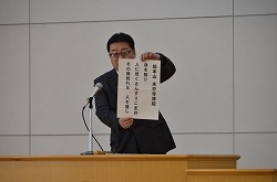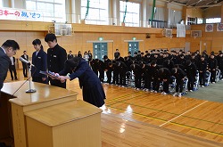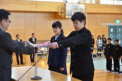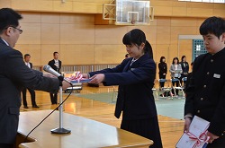15日(水)本校体育館で三学年の修了式を行いました。校長先生より各クラスの代表者、1組:相澤さくらさん、2組:石塚世蓮君、3組:新井来望さんへ「修了証」が渡されました。