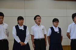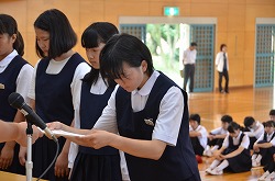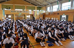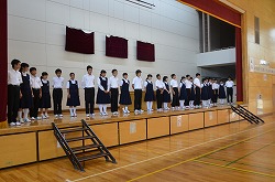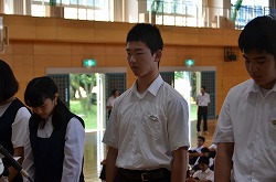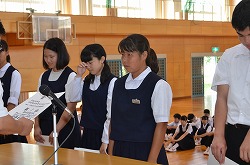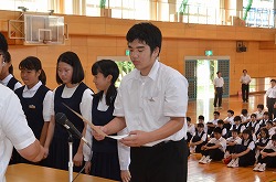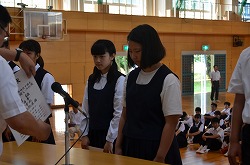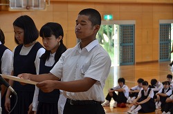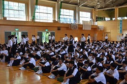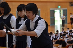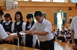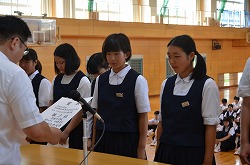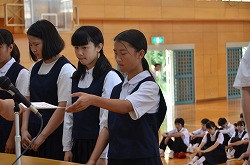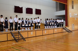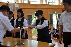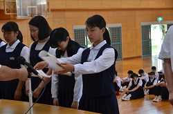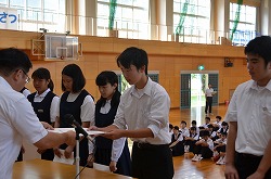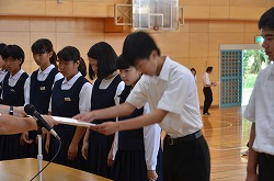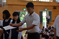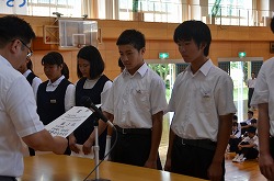 本日、全校朝会で表彰を行いました。はじめに、生活向上委員会と生徒会本部役員による「全校あいさつ運動」を行い、体育館中に大きな「おはようございます」というあいさつが響き渡りました。学校総合体育大会地区予選の陸上部、卓球部女子、柔道部、男女ソフトテニス部、剣道部の総勢51名に賞状を校長先生から渡されました。賞状を受け取った生たちのにこやかな笑顔がとても印象的でした。