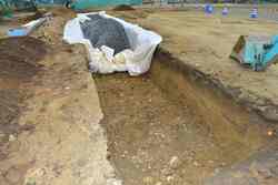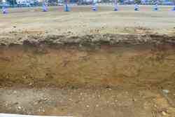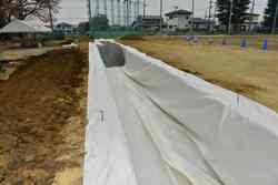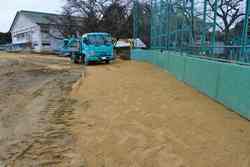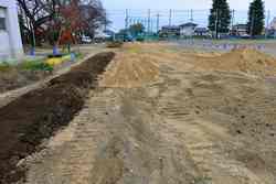 野球部グランド付近の流水及び貯水が著しく、グランド練習に支障をきたすため、校庭の排水関連工事をしていただきました。流水対策として土手を造り、貯水対策として深溝に砂利を入れて浸透させる工事をしていただきました。表面下1mくらいまで粘土層があり、これが排水の妨げになっているように思われます。