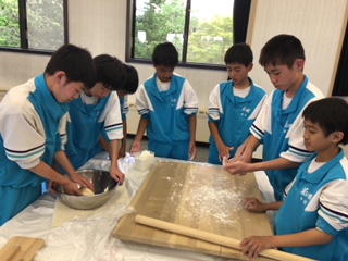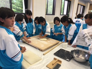 その後、講師の方を招いてう「どん作り」の体験中です。