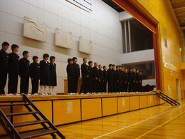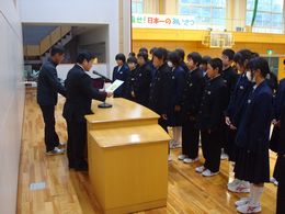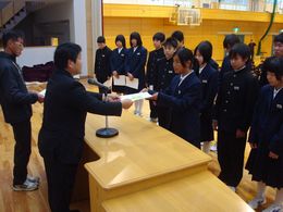 生徒会引き継ぎ式を行いました。新生徒会の役員のみなさん、花園中学校をよりよくするためにがんばっていきましょう。旧生徒会の役員のみなさん、今までありがとうございます。