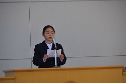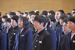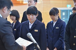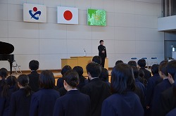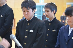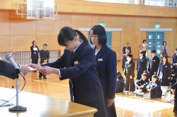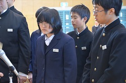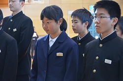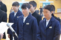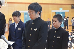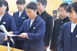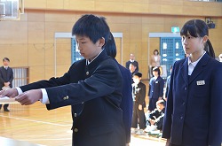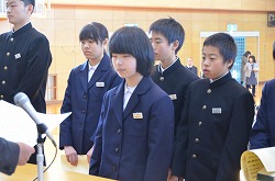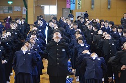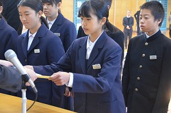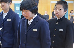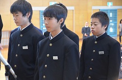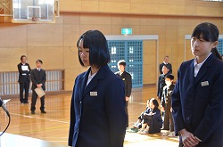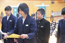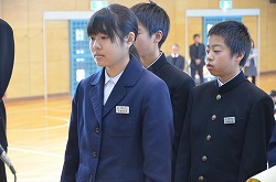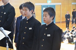 本日22日(金)、本校体育館で二学期終業式・表彰を行いました。式の前に、3年生の須藤智樹と松本詞梨さんがステージに上がり、校歌の練習の指揮をとりました。終業式では、生徒代表の言葉を、1年生代表 秋山愛良さん、2年生代表 中村優花さん、3年生代表 宮尾瑞季さんが発表しました。最後に、向井校長より、校長講話をいただきました。終業式後に、二学期最後の表彰をしました。23名に賞状や認定証が渡され、135名の校内清掃奨励賞(熱心に清掃に取り組んだ生徒に贈られる賞状)受賞者が発表されました。明日から17日間の冬休みが始まりますが、また元気な姿で三学期を迎えましょう。