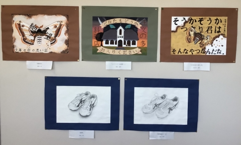 花園公民館まつり、上柴公民館に本校生徒の美術作品が展示されました。現在は校内にその作品が展示されています。それぞれに魅力があり、見入ってしまいます。