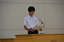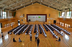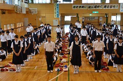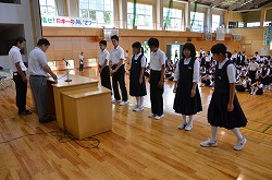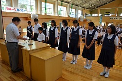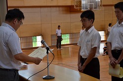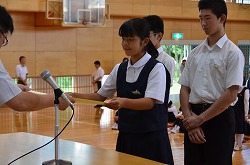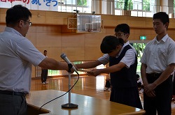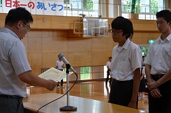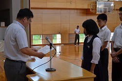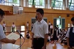 本日、一学期終業式と表彰を行いました。生徒代表の言葉(1年生:宇野杏美さん、2年生:浜川飛優君、3年:根岸凜さん)の発表のあと、校長先生より、「夏休みには、新しいことにチャレンジ(挑戦)してほしい。」と、お話がありました。表彰では、深谷市硬筆展、埼玉県硬筆展、歯・口の健康に関する図画・ポスターコンクール、深谷市民剣道大会の賞状が、30名に渡されました。次に、一学期の間清掃を熱心に行っていた生徒171名に「清掃奨励賞」が渡されました。最後に、7月28日より産休に入る岡田佳織先生からお話をいただきました。岡田先生、体調に十分に注意して、元気な赤ちゃんのご出産を願っています。