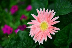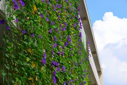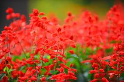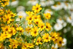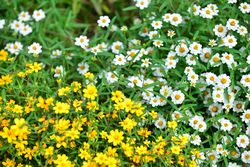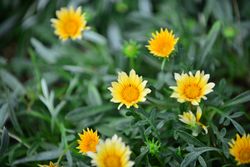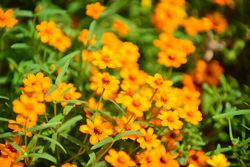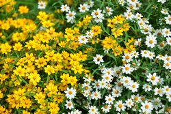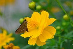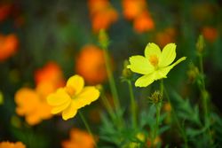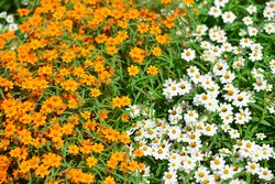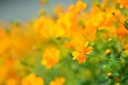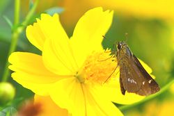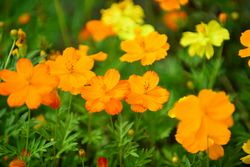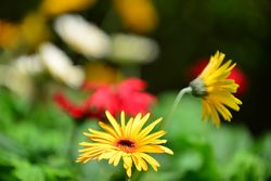 教師と生徒で丹精こめて創った秋の花々が咲いています。(花の種類は、ガーベラ、日々草、サルビア、ペチュニア、ガザニア、百日草、ジニアリネアリス、マリーゴールド、黄花コスモス、琉球アサガオなどです。蝶はイチモンジセセリチョウです。)