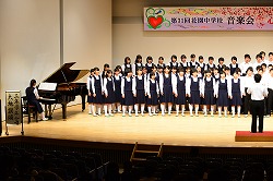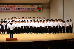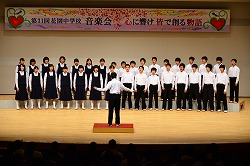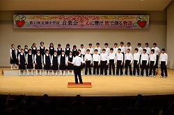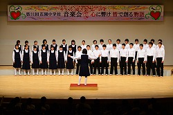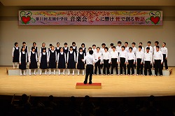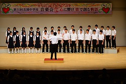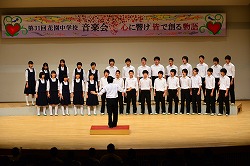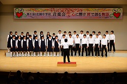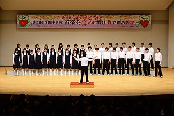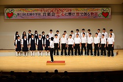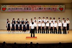 第31回校内音楽会を、市議会議員様、花園総合支所長様、花園公民館長様、自治会支会長様、学校評議員様の多くの御来賓の皆様、そして保護者の皆様をお招きし、アドニスで実施しました。生徒のみなさんの真剣な表情、心のこもったハーモニー、豊かな歌声で、とても感動的な音楽会でした。生徒のみなさん、今まで練習ご苦労様でした。そして、感動を与えてくれて、ありがとう。